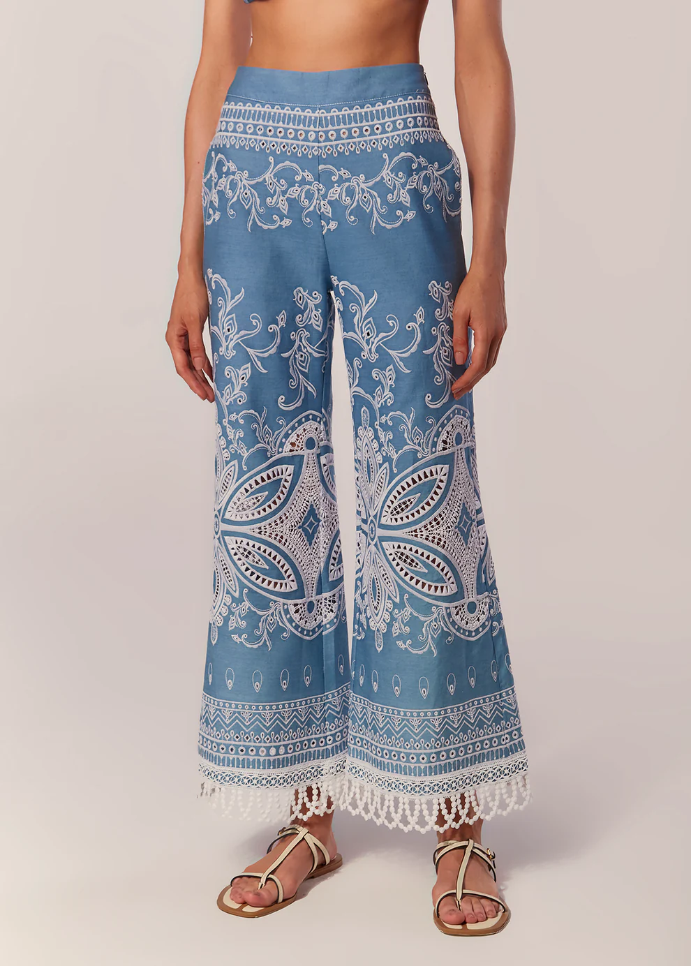 A calça pantalona La Gea apresenta design elegante e versátil, com bordados em off-white em seu comprimento proporcionando um visual autêntico e cheio de personalidade.