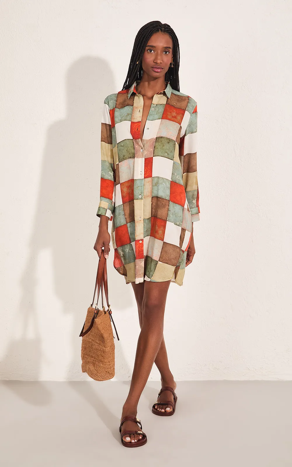 Descrição do Produto: O chemisier com fendas é confeccionado em voil de viscose estampado, com caimento leve e comprimento curto. Possui mangas longas com punhos e barra arredondada que valoriza o movimento. A pala nas costas com prega central garante melhor ajuste e fluidez. A estampa Escala traz um mosaico de azulejos envelhecidos em tons de Laranja Chilli, Turquesa e Off White. Versátil e elegante, é ideal para composições que vão do casual ao sofisticado.