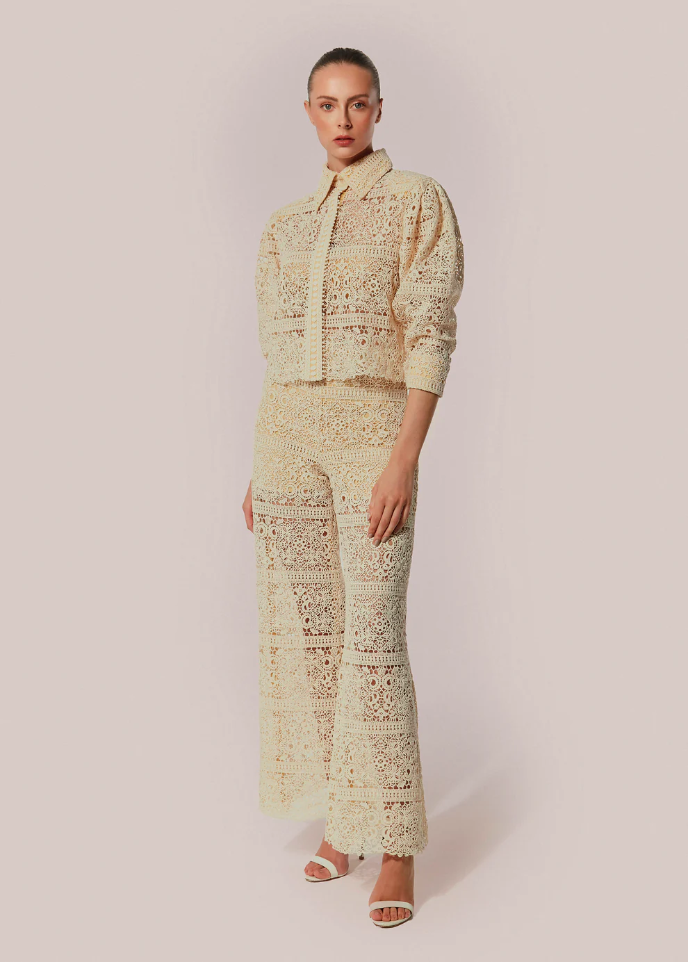 A calça pantalona em renda guipir complementa o conjunto com fluidez e elegância, traduzindo o frescor da estação. O modelo de cintura alta valoriza a silhueta feminina e possui zíper invisível na lateral, mantendo um acabamento sutil e sofisticado. Desenvolvida com forro curto embutido, a peça equilibra transparência e conforto, destacando a riqueza dos detalhes que elevam o visual.