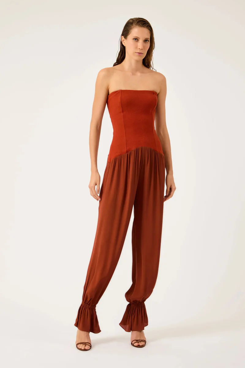Macacão tomara que caia com corpo ajustado em malha texturizada e calça em crepe leve. A parte superior é estruturada, moldando o torso, enquanto a transição para a calça tem um recorte arredondado. A calça apresenta modelagem ampla com franzidos no quadril e barra ajustada por elástico, criando efeito balonê.