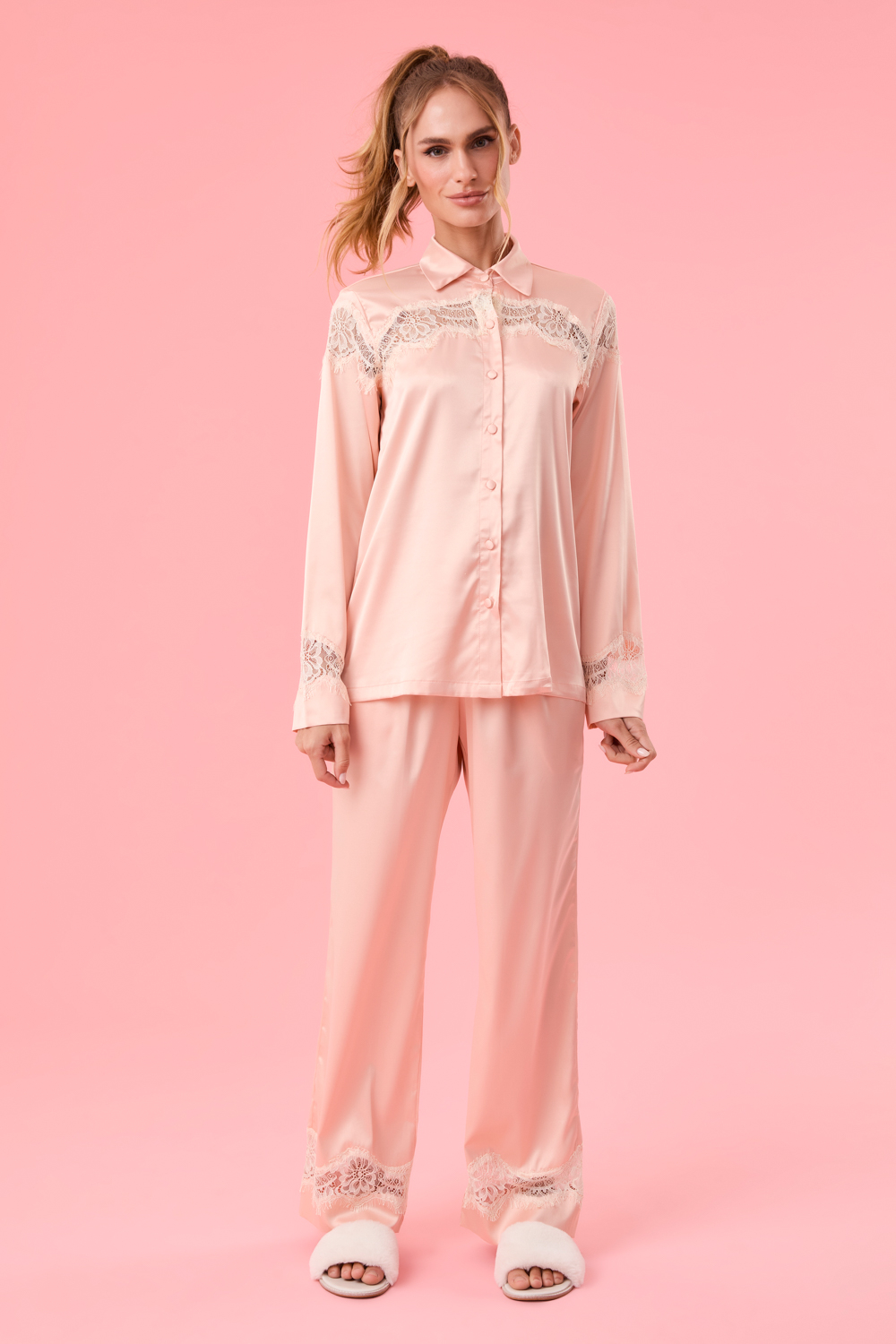 Pijama da linha Laces, confeccionado em cetim de brilho sutil, tecido confortável, leve e de toque super macio com aplicações de renda vazada nos detalhes. Composto por duas peças: Camisa com abotoamento frontal com botões forrados, gola camisa e mangas longas; Calça com elasticidade no cós, rolete da cintura para ajuste, bolsos faca nas laterias e barra reta com detalhe de renda vazada.