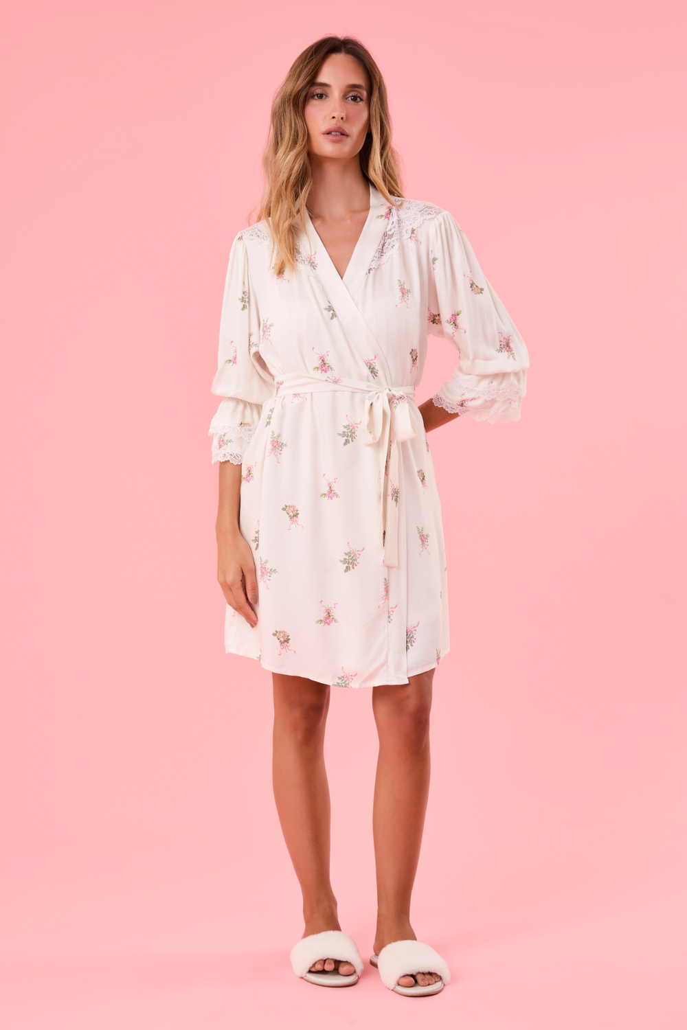 Robe curto da linha Flowery, confeccionado em viscose com leve elasticidade, fresco, confortável, macio e caimento impecável. Possui modelagem reta, renda vazada nos detalhes dos ombros e barra da manga, transpassado com fechamento interno por rolete na altura da cintura e faixa solta para amarração externa com finalização de laço, mangas bufantes 7/8 com babado barra duplo e leve franzido no topo dos ombros.