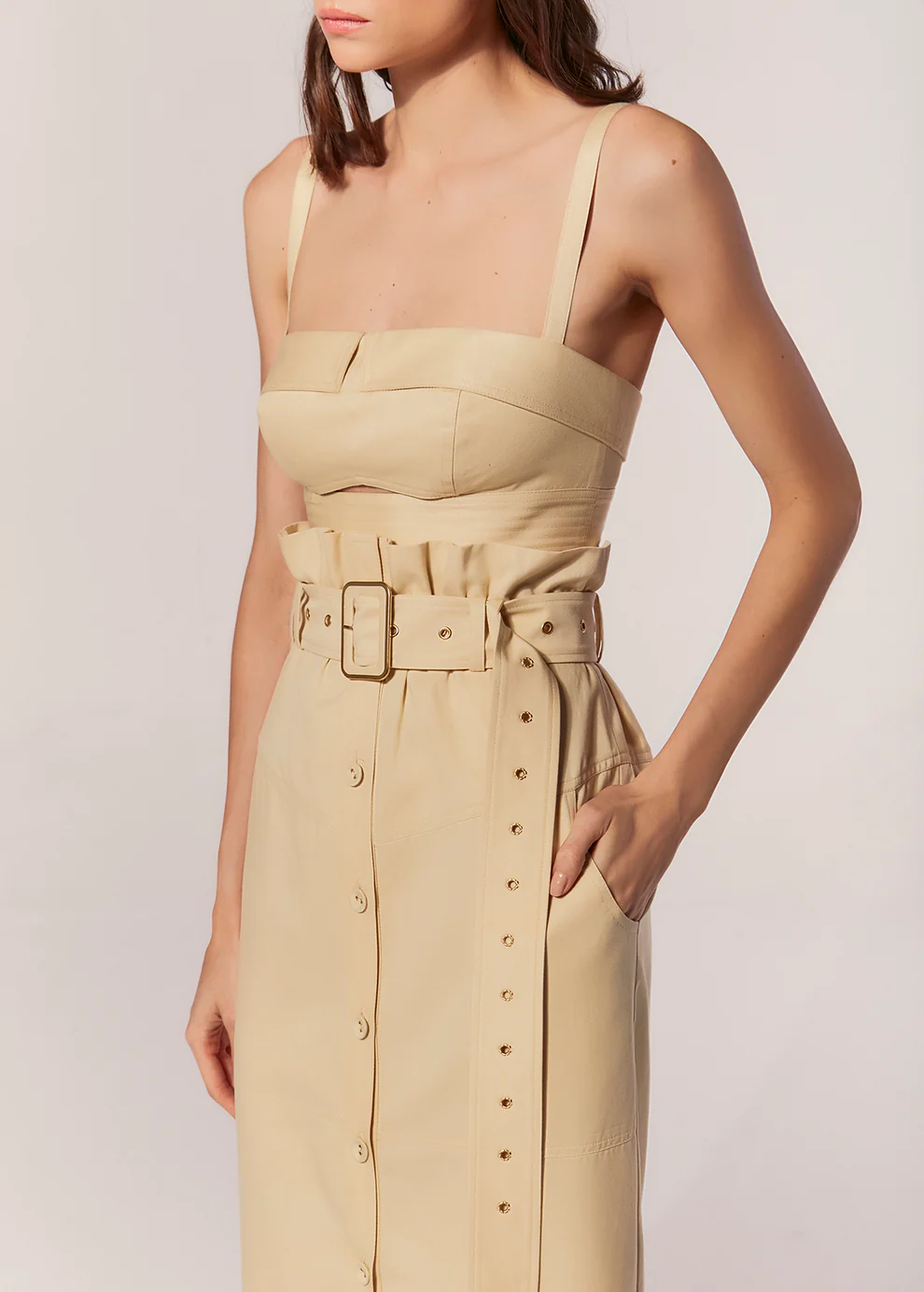 Simbolo da elegância e casualidade na mesma medida, a Saia Midi com Cinto Sopros, traz o comprimento ideal com refinamento. Em tencel e algodão, a saia traz uma composição leve, estruturada e macia que garante conforto e movimentação ao corpo. Com costuras, botões e acessórios na cor Caqui a peça traz e monocromático que eleva as produções com versatilidade. Combine com tops curtos ou camisas.