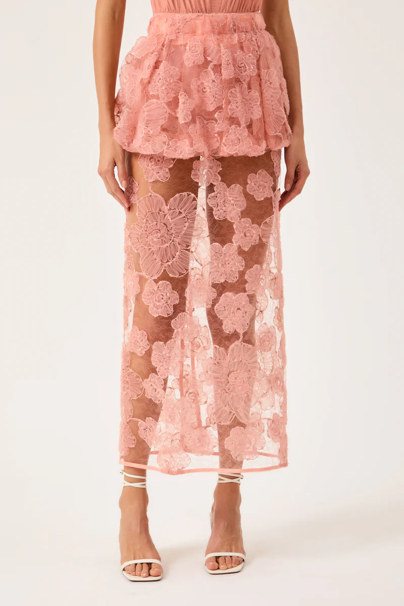 Saia em renda floral com modelagem reta e fenda nas costas para facilitar ao andar. Possui transparência, enquanto o peplum removível, preso por botões, adiciona volume estratégico e versatilidade. Acompanha Hot Pants separada em tule.