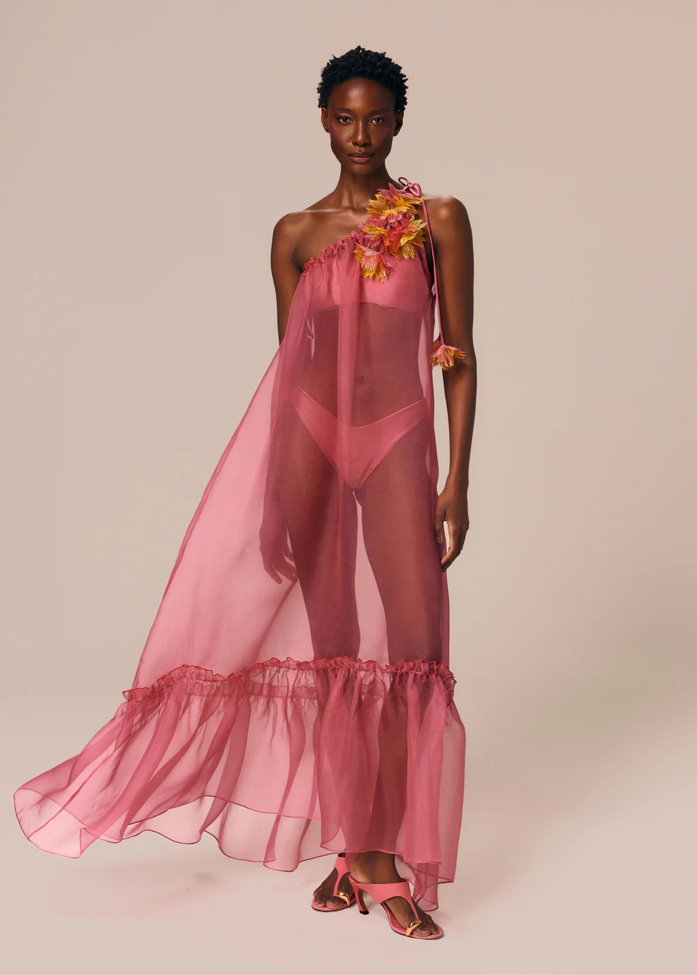 O vestido de ombro único traz amarração no próprio ombro, criando um ponto de interesse sutil no desenho.